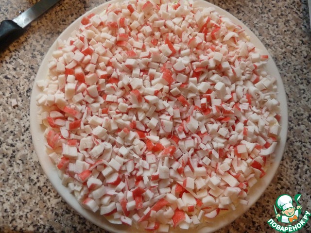 Нарезаем крабовые палочки на мелкие кубики и выкладываем следующим слоем.