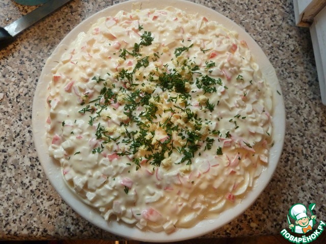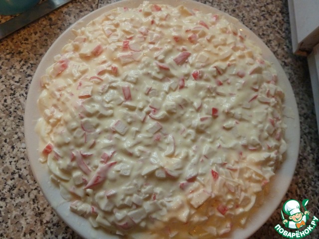 Смазываем крабовые палочки майонезом с солью - это будет последний слой.