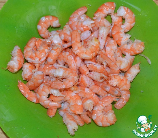 Креветки отвариваем 3 минуты в кипящей подсоленной воде, остужаем, чистим