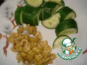 Огурец нарезаем тонкими полукольцами. Оливки разрезаем на 4 части.