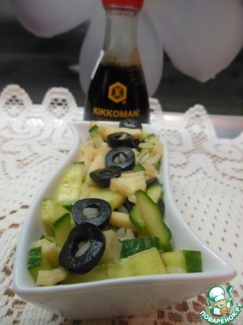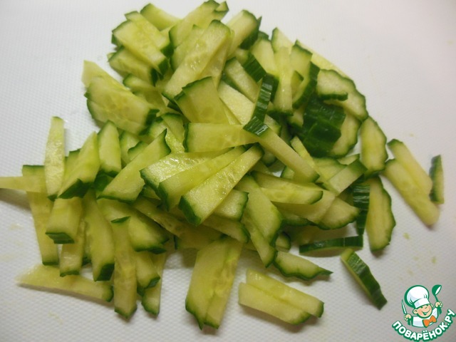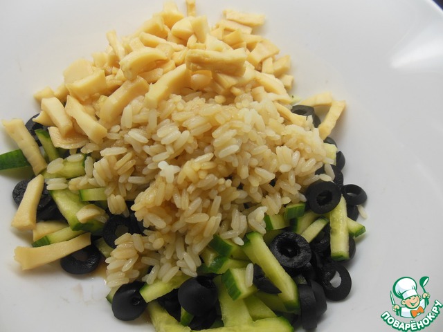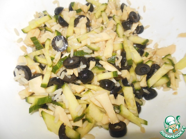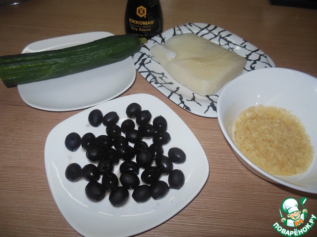 Подготовим наши ингредиенты. Огурец помыть, рис и кальмар отварить.