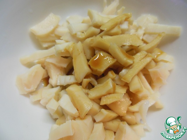 Вареный кальмар нарезаем соломкой и поливаем его соевым соусом.