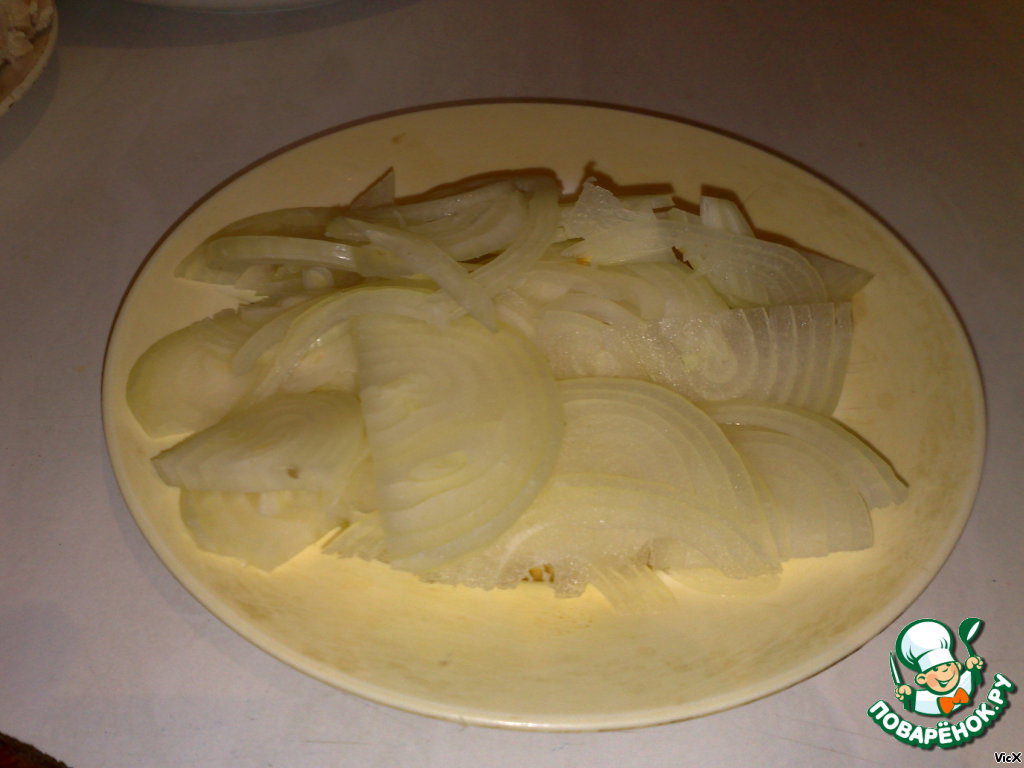 На кухне был найден, почищен и нарезан тонкими полукольцами лук.