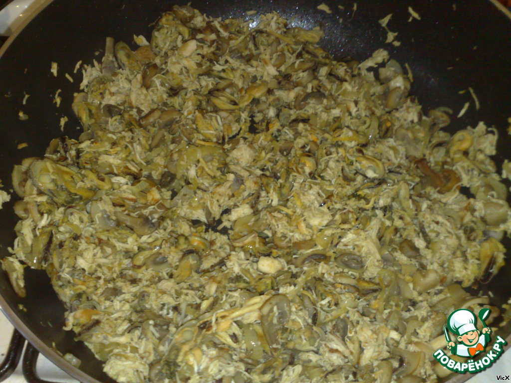 После чего добавляем мидии и полстакана вина.
