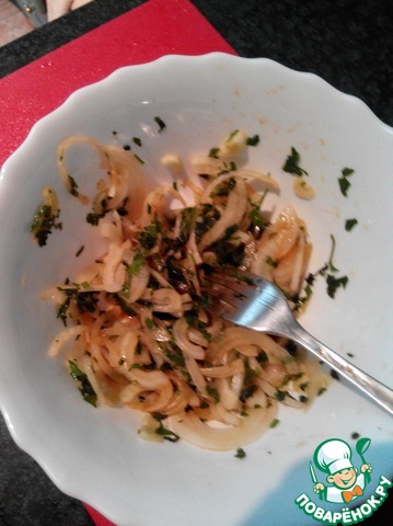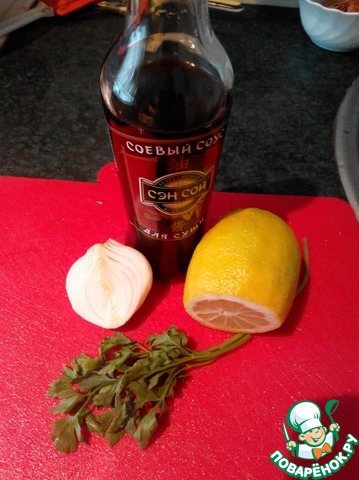 Лук нарезаем \"пергаментными\"пол укольцами, чем тоньше порежете тем лучше! петрушку мелко крошим. Выдавливаем сок половины лимона, заливаем соевым соусом