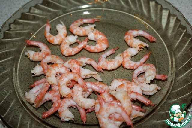 Креветки помыть и сварить в подсоленной воде 2 минуты, промыть холодной водой и откинуть на сито.