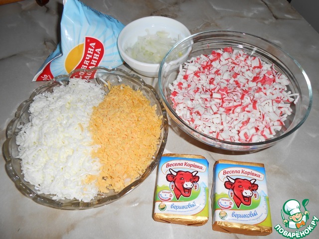 На приготовленное блюдо выкладывать каждый слой, смазывая майонезом: белки, лук, крабовые палочки, сырок плавленный, желток.