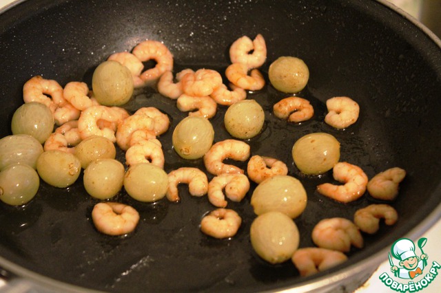 Виноград вместе с креветками слегка обжариваем на подогретом оливковом масле. Остужаем.