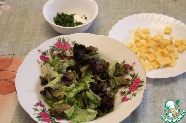 Листья салата рвем руками на крупные куски, подойдет любой листовой салат, я же использовала салат лолло роса. Сыр нарезаем квадратными кусками средней величины, зелень измельчаем.