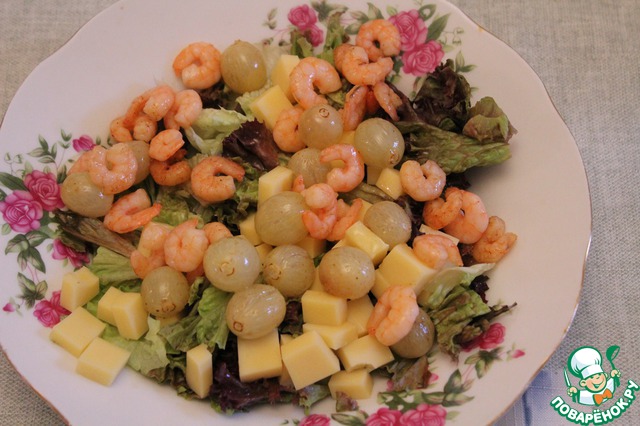Соединяем виноград и креветки с салатными листьями и сыром.