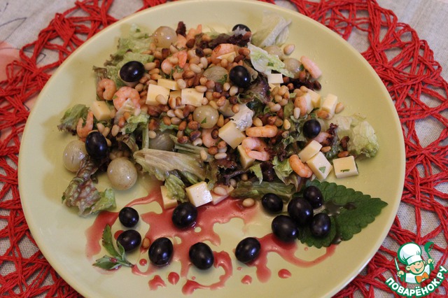 Получившейся заправкой хорошо поливаем салат, все перемешиваем и выкладываем на блюдо. Сверху все посыпаем кедровыми орешками, слегка обжаренными на сухой сковороде. Украшаем темным виноградом.