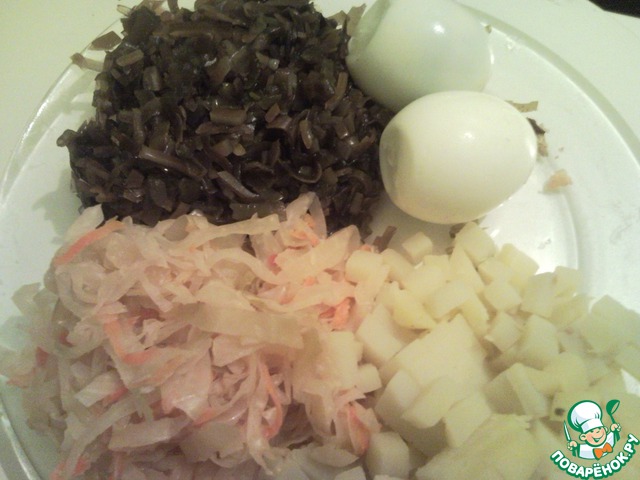 Яйца и картофель отвариваем. Капусту морскую консервированную я промываю, по-желанию можно порезать. Режем яйца и отварной картофель.