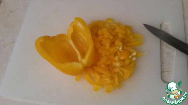 Болгарский перец нарезаем недлинными тонкими полосками.