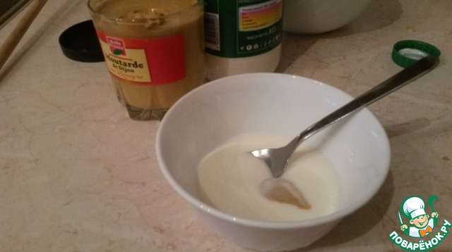 Для заправки смешиваем 40 г натурального йогурта без добавок и наполнителей (у меня Активия "Натуральная") и 10 г дижонской горчицы. Лучше брать именно дижонскую, у неё мягкий вкус и она придаёт неповторимую прелесть заправке!