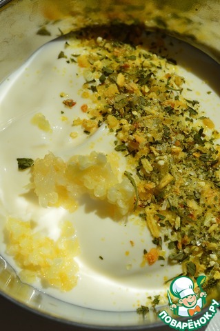 Сметану смешать с раздавленным зубчиком чеснока и специями (у меня были специальные для салата), дать заправке настояться 5 минут. Для мужчин, скорее всего, подойдет заправка из домашнего майонеза, чеснока и зелени.