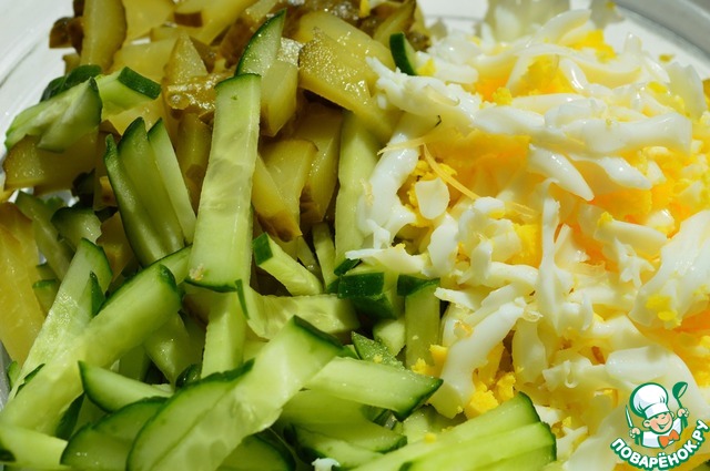 Огурчики нарезать как нравится, сыр натереть на мелкой терке. Для салата нужно только половина порции сыра, остальной половиной украсим салат