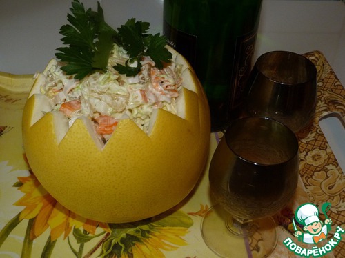 | Мой салат с крабовыми палочками, наверное, на Поваренке будет 1001-ым! Похожего салата не нашла, поэтому решила поделиться. Салат чрезвычайно просто готовится. На вкус достаточно приятный. При этом он и легкий и сытный. Если салат подается в "вазочке" из кожуры помело, то очень даже неплохо смотрится на праздничном столе. И, по-моему, такой салат подойдет для романтического ужина. |