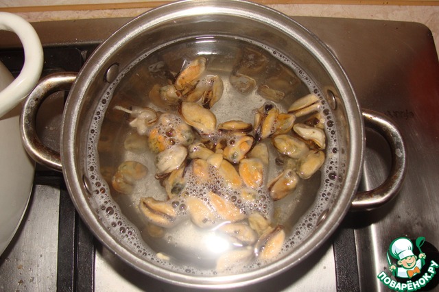 Мидии отварить в подсоленной воде в течении 3-5 мин.