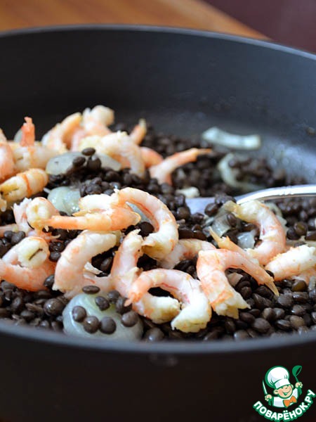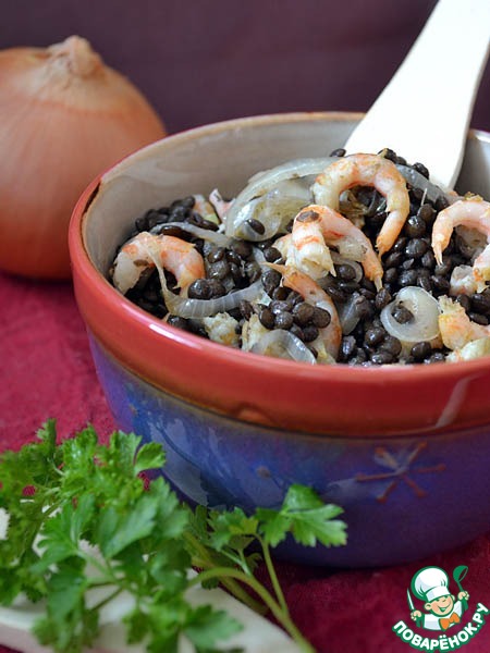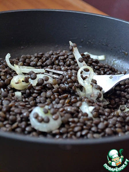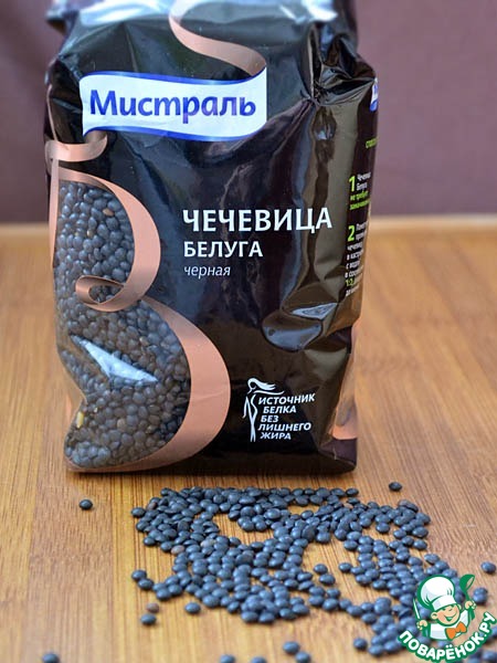 Для этого блюда идеально подойдет черная чечевица "Белуга". Этот самый мелкий сорт чечевицы при варке сохраняет форму и цвет.