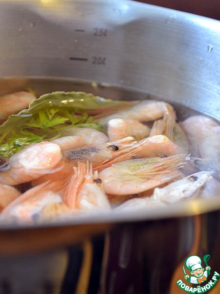 Отвариваем креветки. Сливаем воду. Даём креветкам остыть, очищаем их.