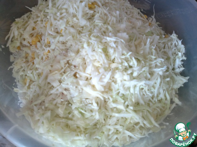 Слить воду с кукурузы, добавить к крабовым палочкам. Капусту (если вилок большой, то взять половинку), нашинковать, тоже добаить к палочкам и кукурузе.