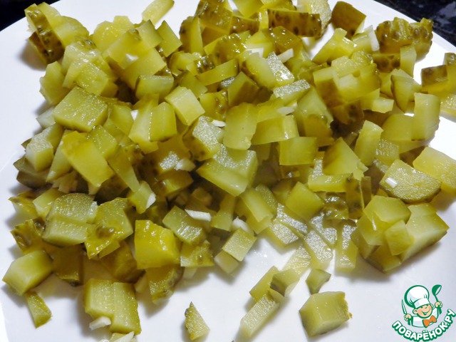 Сначала часть мяса, майонез. Огурцы с чесноком, майонез.