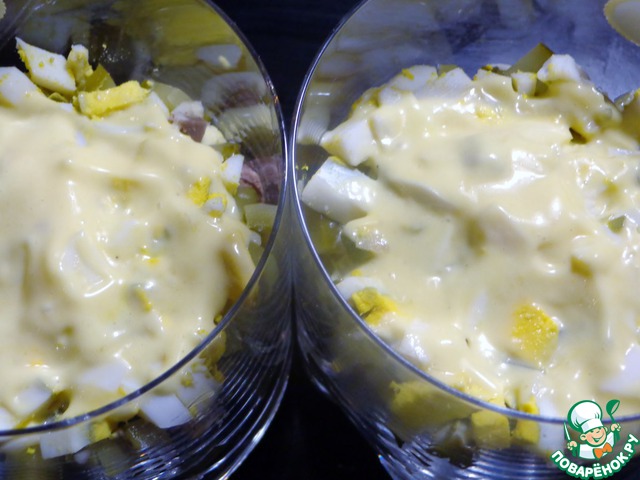 Выкладываем ингредиенты в стакан или салатницу, промазывая каждый слой майонезом. Я взяла майонез «Махеевъ» на перепелином яйце, т. к. он очень качественный и не содержит крахмала.