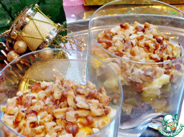 Повторяем слои 2 раза. Сверху украшаем грецкими орехами.