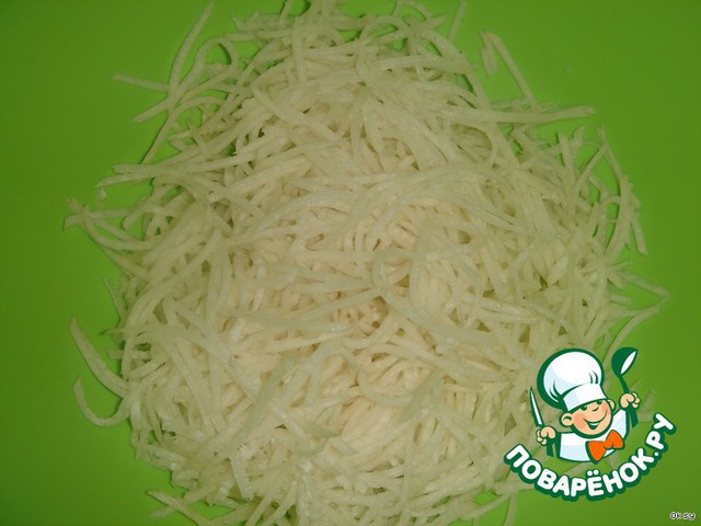 Дайкон или редьку потереть на терке для корейских салатов.