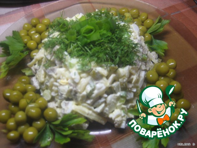 Соединяем, заправляем майонезом, украшаем зеленью и горошком.