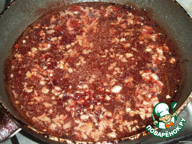 В оставшееся на сковородке масло кладем измельченный чеснок, обжариваем, вливаем вино, добавляем соль и сахар по вкусу.