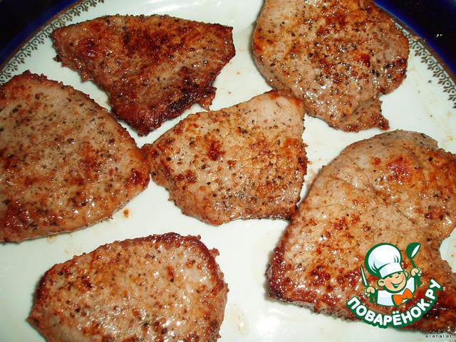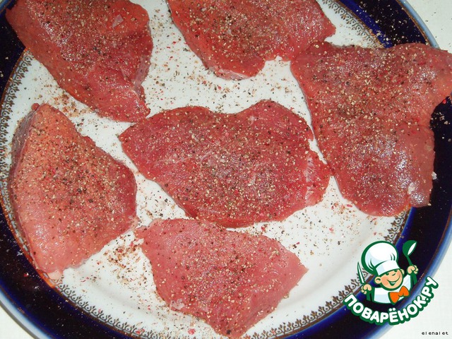 Мясо посыпать перцем и солью. По рецепту - 3 ломтя, размером с ладонь, но у меня был один кусочек, который я порезала на небольшие ломтики.