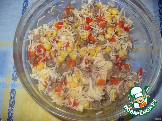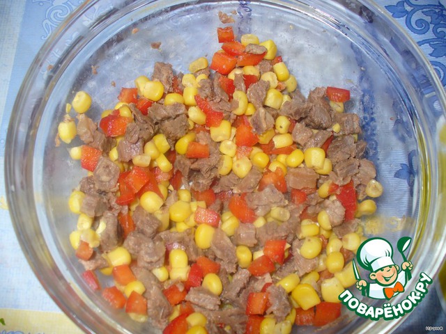 К мясу добавить кукурузу (без жидкости) и нарезанный кубиками красный сладкий перец. Перемешать.