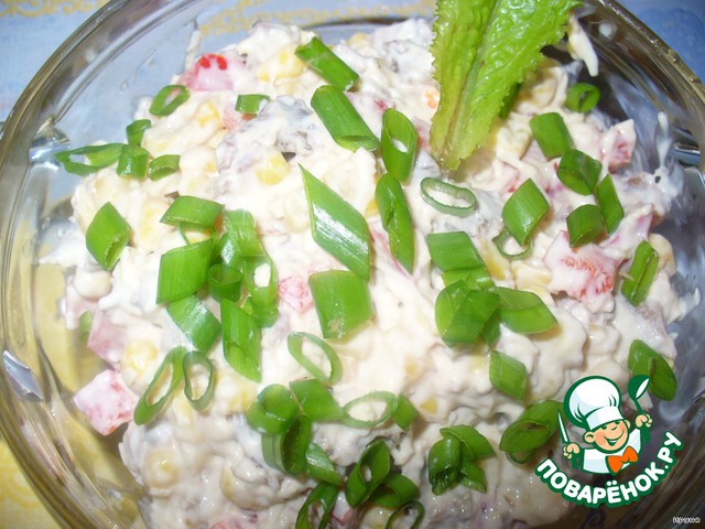 Заправить майонезом и перемешать. Соль и перец - по вкусу и желанию. Сверху посыпать нарезанным зеленым луком. Украсить зеленым салатом.