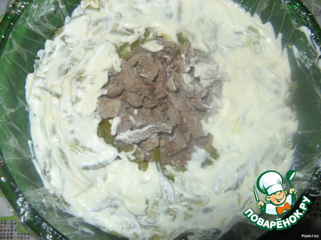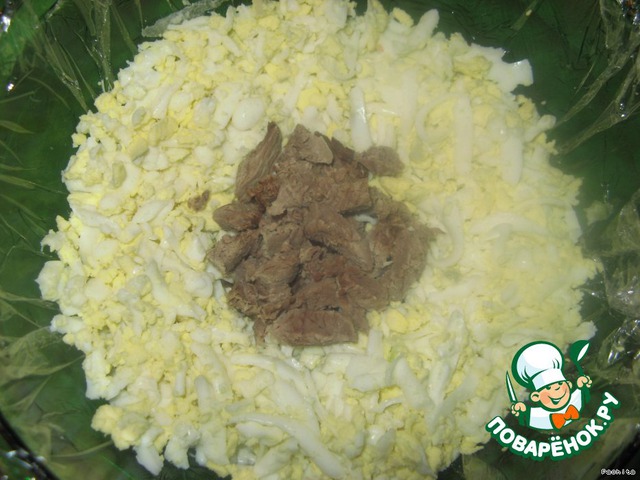 Выкладывать слоями так, чтоб посередине было мясо, промазывая майонезом.