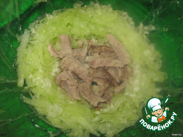 Глубокий салатник смазать растительным маслом, застелить пищевой пленкой.