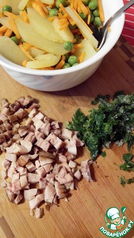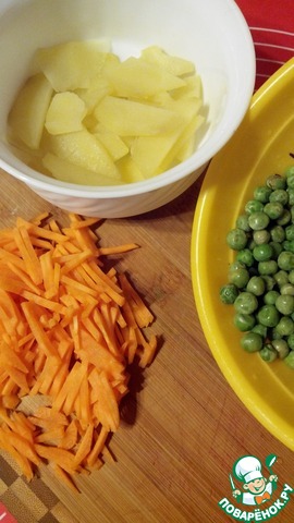 Картофель очистить и нарезать тонкими ломтиками. Сырую морковь натереть на корейской терке или нарезать тонкими брусочками. Зеленый горошек обдать кипятком (разморозить).