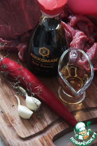 Говядину (очень важно брать мягкую часть - вырезку или мякоть) нарезать тонкими ломтиками.