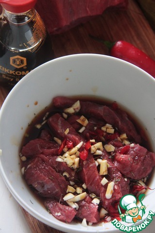 В глубокую пиалу налейте соевый соус, виски, добавьте мелко нарезанный чеснок, чили и тимьян. Все перемешайте и положите мясо в соус.