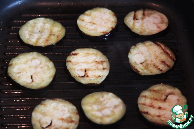 Разогрейте сковороду-гриль, добавьте немного оливкового масла и обжаривайте баклажаны с двух сторон.