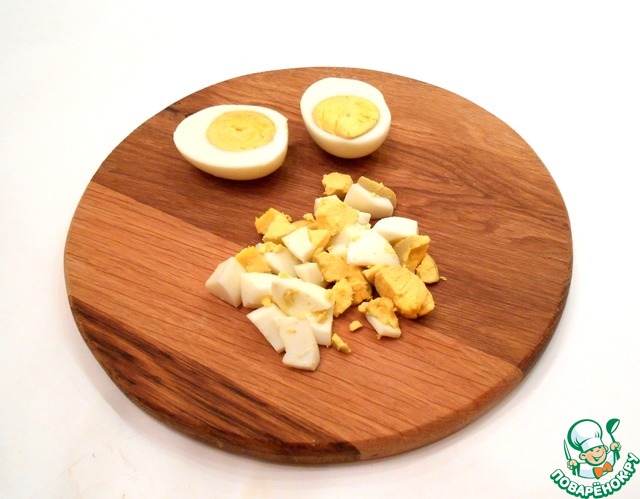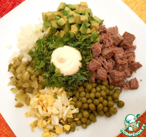 6. Соединяем ингредиенты, добавляем горошек, нарезанную зелень, заправляем майонезом (домашним, сметаной – кому как больше нравится).