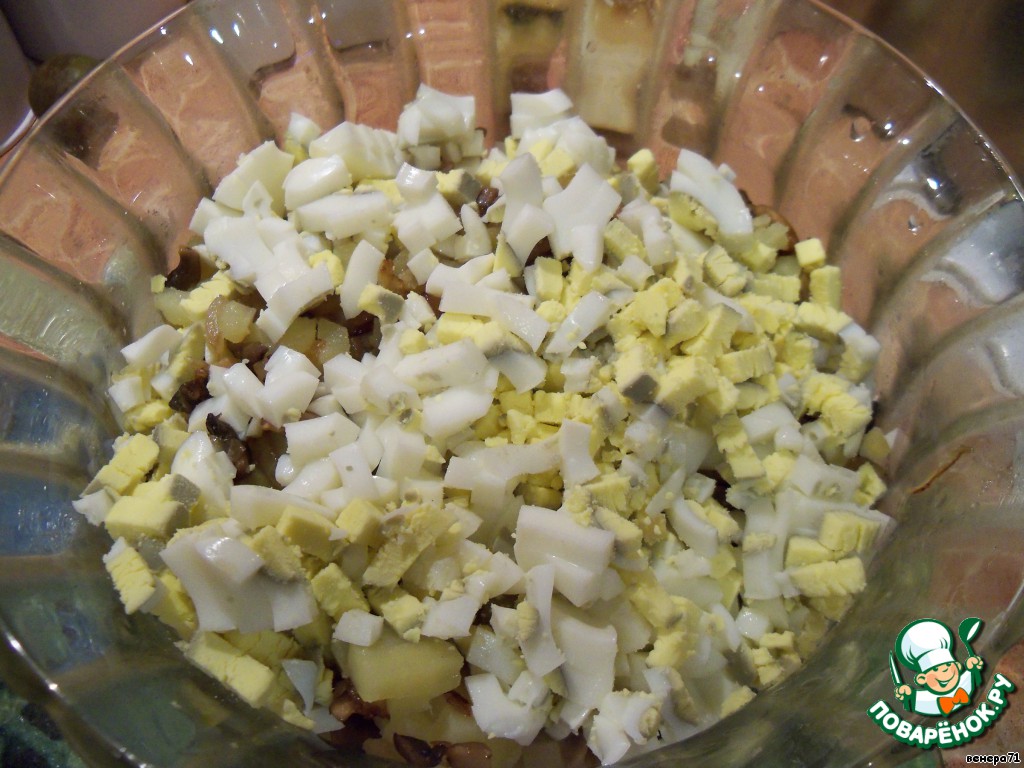 Яйца отварить, почистить, нарезать мелкими кубиками.