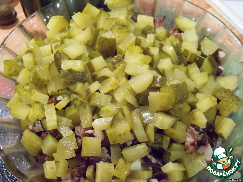 Отварное мясо и сыровяленую колбасу (можно обойтись и без нее) мелко нарезать.