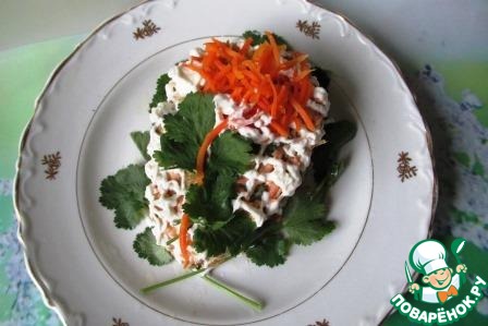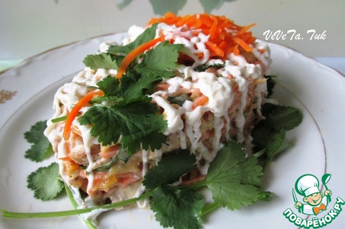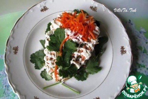 Красиво оформим наш салат морковью, майонезом и веточками кинзы и подадим на стол. Приятного вам!