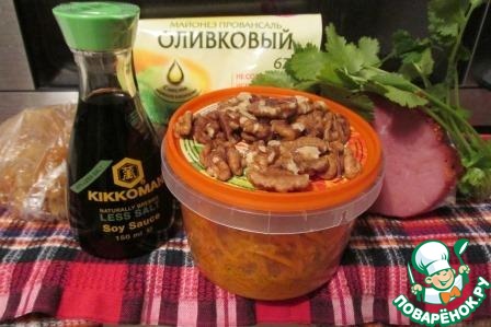 Мелко нарубим орехи, мясо нарежем небольшими кубиками и в миске смешаем его с морковкой и соевым соусом. Я использую соевый соус "Киккоман" легкий, с пониженным содержанием соли.