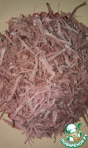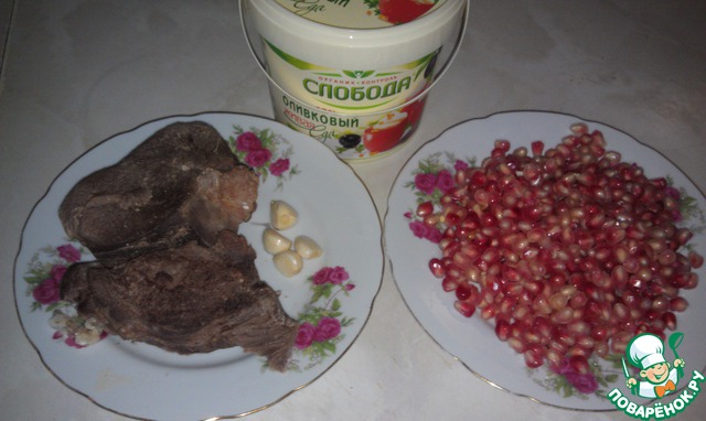Гранат очистить (правда, мне попался со светлыми зернами, но на вкус хороший), говядину разобрать на волокна.