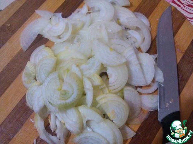 Лук порезать тонкими полукольцами и жарить до слегка золотистого цвета.