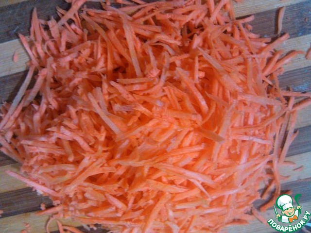 Тонко и длинно нашинковать морковь. Если есть корейская терка, то можно натереть на ней.