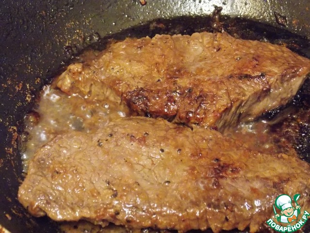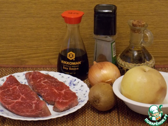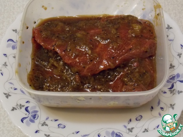 Самое долгое в нем приготовления говядины. Для нее мы очищаем киви, трем его и соединяем с соусом, перчим. Все перемешиваем. Намазать стейки и оставить мариноваться 30 мин., но НЕ БОЛЕЕ 1 ЧАСА.