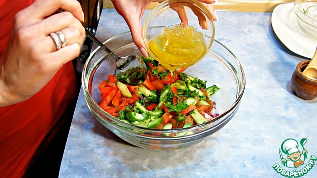 Заправляем маслом, которое сутки настаивалось на измельченном чесноке.